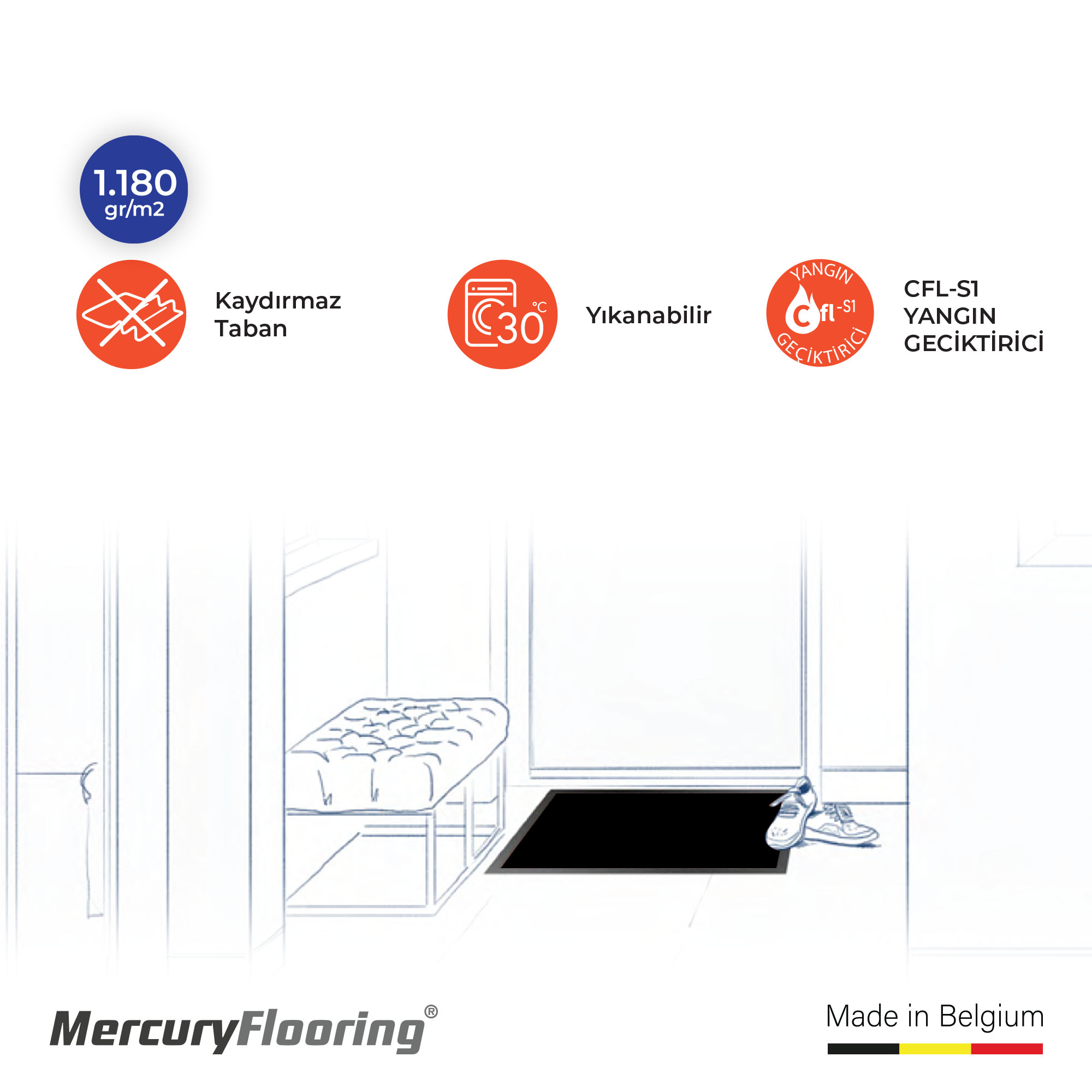 Belçika üretimi Mercury Flooring paspasları, Avrupa kalite standartlarına uygun üretim anlayışıyla uzun ömür, konfor ve şıklığı bir araya getirir.